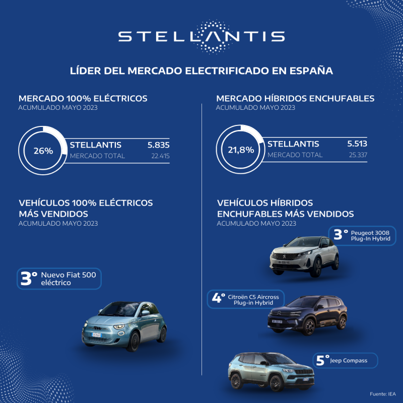 Además, en los cinco primeros meses de 2023, Stellantis ha registrado 5.513 matriculaciones de automóviles híbridos enchufables, con una cuota del 21,8, situando a tres modelos en el Top 5 de este mercado: Peugeot 3008 Plug-in Hybrid, Citroën C5 Aircross Plug-in Hybrid y Jeep Compass.