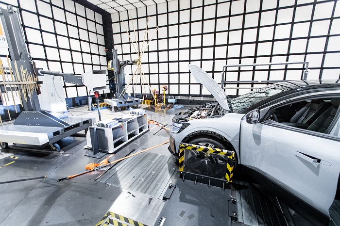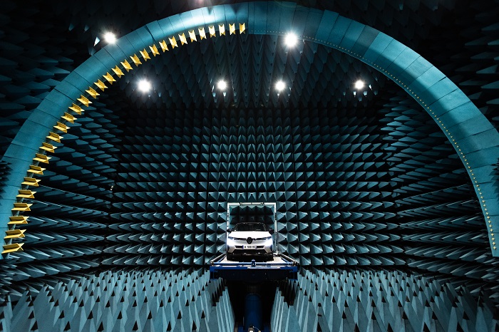 No lejos de allí, otra cámara especial llama la atención. En ella trabaja Xavier, experta en compatibilidad electromagnética. Los muros de esta sala están cubiertos de paneles blancos que cubren una gruesa capa de materiales aislantes. Allí se encuentra otro Nuevo Megane E-TECH 100% eléctrico para someterse a pruebas en un banco de rodillos que permite simular una situación de conducción. Unas antenas rodean el coche y lo bombardean de ondas de todas las potencias y frecuencias. De hecho, un vehículo en circulación está sometido a campos electromagnéticos , tanto al acercarse a cualquier tipo de antena, emisores o radares, y hay que asegurarse de que nada altere el funcionamiento del vehículo.«Estamos en una cámara de Faraday. Las paredes de esta sala retienen las ondas electromagnéticas y nos aíslan del ecosistema exterior. De este modo, podemos probar las prestaciones de emisión y recepción del coche en una gama de ondas amplia : radio, o GPS» , explica Xavier.