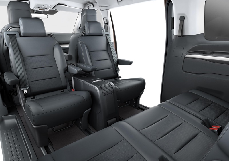 Dando prioridad al espacio y al confort, PROACE VERSO VIP ofrece hasta siete plazas con cómodos asientos tapizados de piel, en configuración 2+2+2 o 2+2+3. Los asientos de la segunda y tercera fila van montados sobre raíles y son deslizantes y extraíbles, permitiendo configurar el habitáculo al gusto. Entre ambas filas posteriores hay una mesa abatible que se puede desplegar para un mayor confort de los ocupantes traseros. Además, la fila central de asientos de ambas configuraciones, 6 ó 7 plazas, son pivotantes y se puede girar hacia atrás, para una configuración tipo ‘mesa de reunión’.