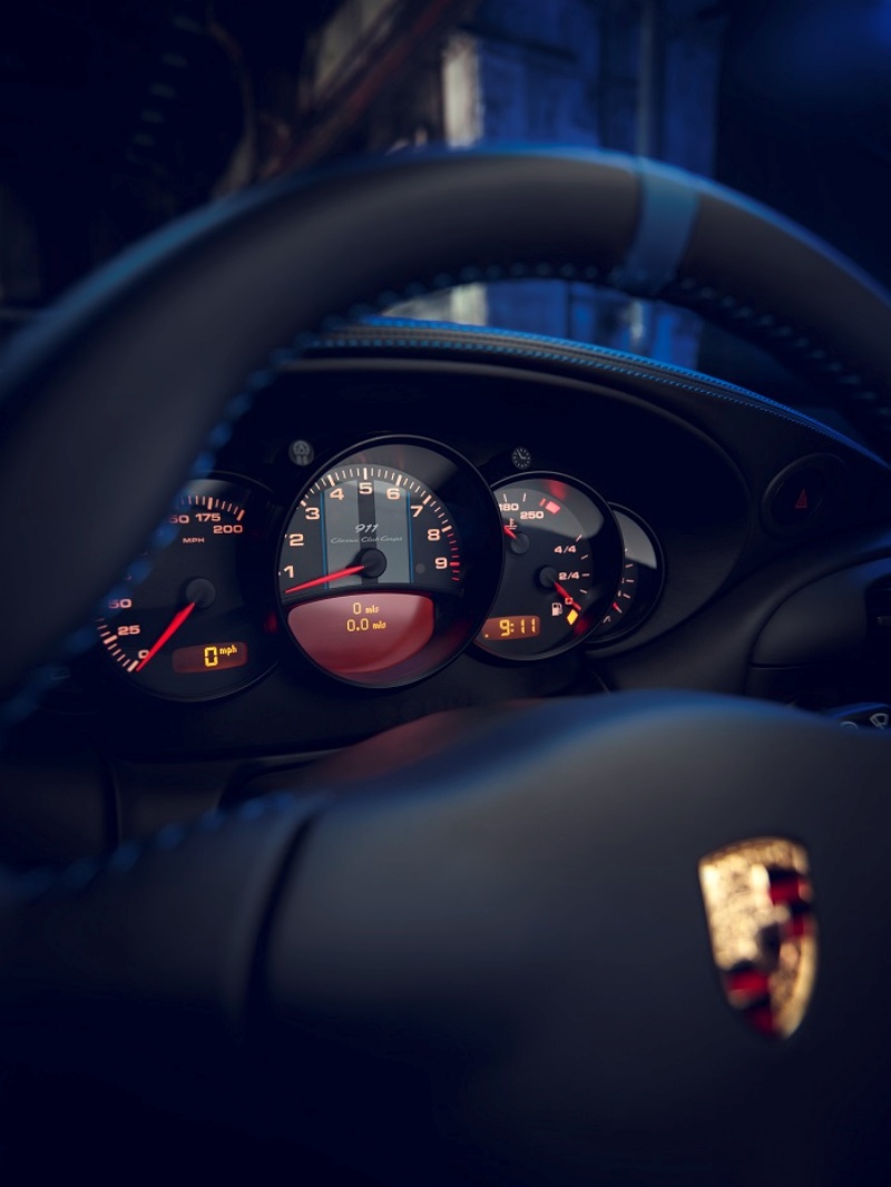 Los relojes redondos del cuadro de instrumentos están personalizados como en el 911 Sport Classic. El cuentarrevoluciones, por ejemplo, presenta el emblema “911 Classic Club Coupe” y también dos franjas grises rematadas en sus extremos con líneas de color azul Club. El sistema de infoentretenimiento Porsche Classic Communication Management Plus con Sirius XM, Apple CarPlay y Google Android Auto también forma parte de la dotación tecnológica. Como detalle específico, la pantalla de 7 pulgadas muestra un gráfico de inicio con la inscripción “Classic Club Coupé”.