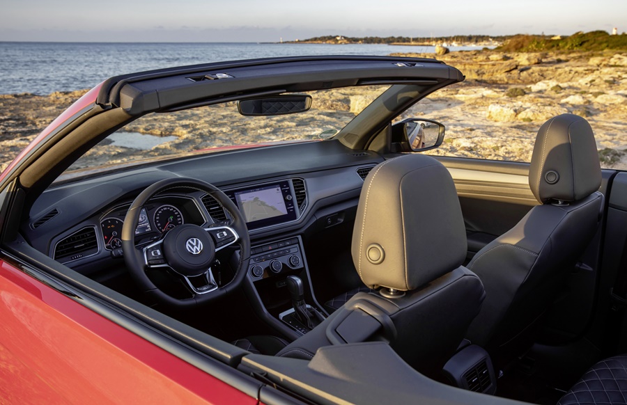 Tela ligera. Al igual que el Escarabajo y el Golf descapotable tradicionales, el T-Roc Cabrio cuenta con una capota de tela ligera y clásica de tres capas. Un motor electrohidráulico la abre y cierra, en 9 y 11 segundos respectivamente, de forma totalmente automática, incluso durante la conducción a una velocidad de hasta 30 km/h. La capota blanda abierta se pliega en forma de Z detrás de los asientos traseros y su gran cercha delantera sirve de cubierta. De manera opcional, Volkswagen ofrece paravientos. Cuando la capota está cerrada, las molduras de sujeción evitan que se hinche cuando se circula a velocidades altas. A bordo, reina una agradable tranquilidad, también gracias a las elaboradas juntas de puertas y ventanillas.