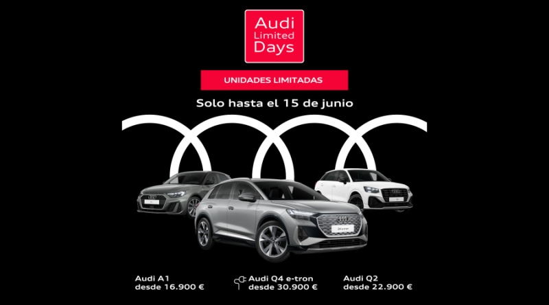 Sin duda, Audi Limited Days es la oportunidad perfecta para dar el salto a la movilidad premium en cualquiera de sus vertientes. Hasta el próximo 15 de junio, diseño, tecnología, conectividad, deportividad y sostenibilidad están al alcance de todos los clientes con descuentos irrepetibles en unidades limitadas. Los interesados pueden acudir a cualquier concesionario de la Red Oficial de Audi en Canarias para conocer más sobre esta promoción o solicitar información a través de las redes sociales y página web de Audi Canarias. Pide tu cita a través del siguiente enlace y disfruta del Audi de tus sueños ahora mismo: https://formulario.audicanarias.com/audi-limited-days