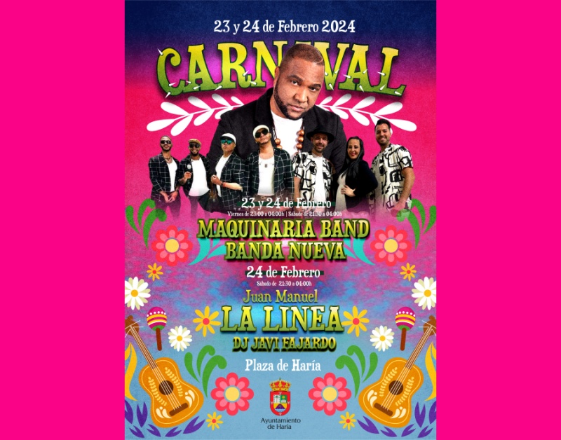 Los actos programados para el sábado, 24 de febrero, comenzarán con el Pasaplaza en la Plaza de Haría a las 12:00 horas. Seguido del Coso del Carnaval con desfile desde el cementerio hasta la Plaza de Haría. Y finalizará con la Verbena de Carnaval, que contará con DJ Javi Fajardo y actuaciones de Juan Manuel La Línea y las orquestas Maquinaria Band y Banda Nueva en la Plaza de Haría a partir de las 21:30 horas hasta las 04:00 de la madrugada.