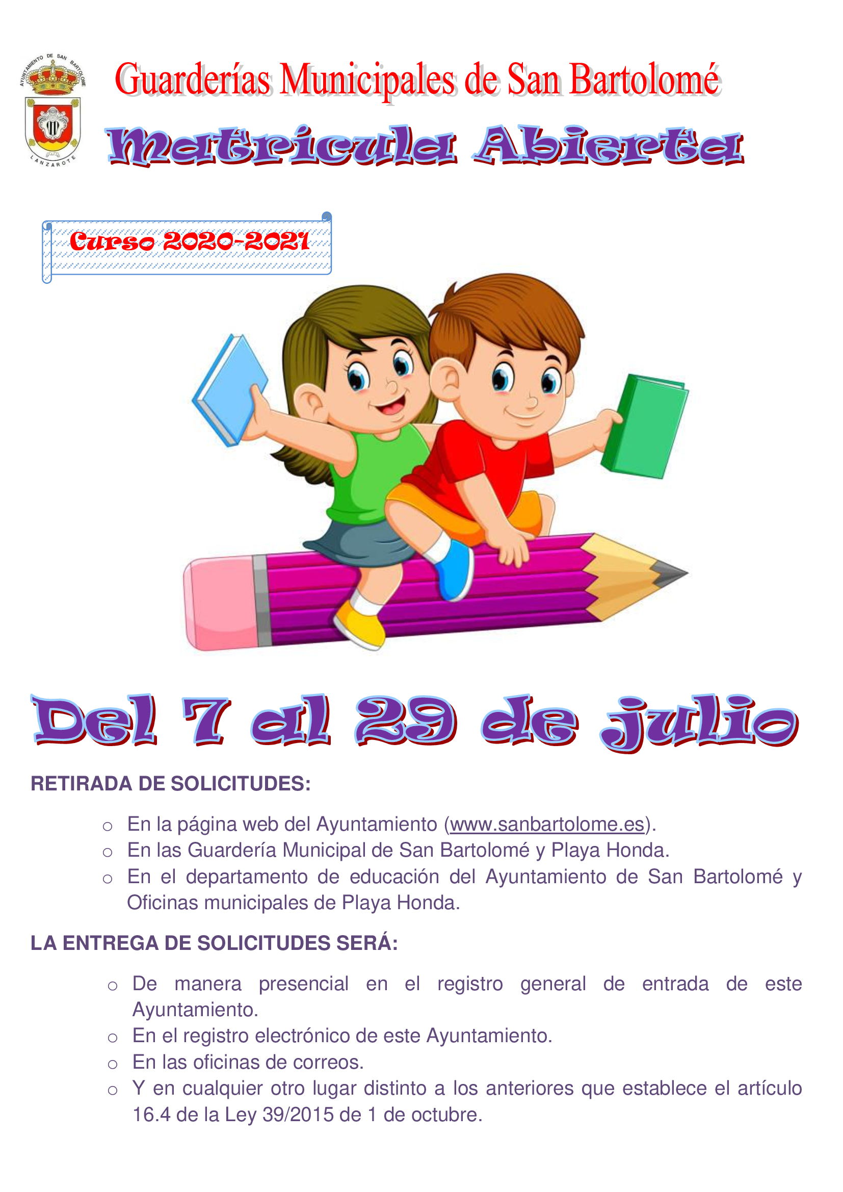 El Ayuntamiento de San Bartolomé, a través del área de Educación, delegada en Alma María González, pone en conocimiento general de los/as interesados/as que está abierto el plazo para la presentación de solicitudes de renovación y nueva inscripción en las Guarderías Municipales de San Bartolomé y Playa Honda.