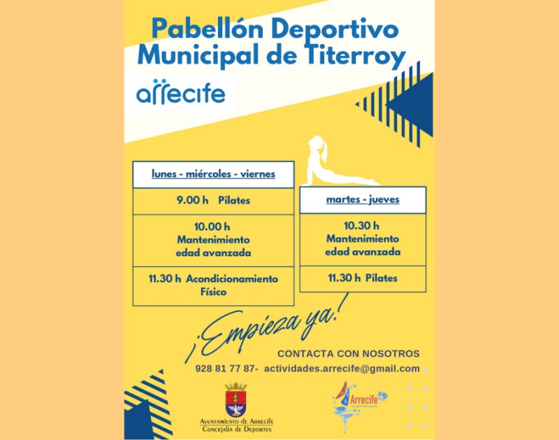 El Ayuntamiento de Arrecife, que preside Astrid Pérez, ofrecerá a partir de este lunes 13 de junio, a través de la Concejalía de Deportes dirigida por Rosmen Quevedo, actividades dirigidas, gratuitas y reservadas a personas adultas en el remozado Pabellón de Titerroy. En concreto, se impartirá de lunes a viernes en horario de mañana Pilates, Mantenimiento para Edad Avanzada y Acondicionamiento Físico.