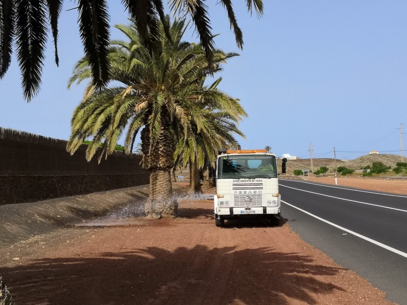 El Ayuntamiento de Yaiza sigue con su plan de actuación para la conservación de palmeras del municipio con trabajos de riego realizados este miércoles en la carretera que une los pueblos de Yaiza y Uga. Operarios municipales coordinados por el concejal de Jardines, Rubén Arca, trabajan en el mantenimiento de márgenes de carreteras y el cuidado de palmeras que también conlleva el saneamiento de los ejemplares cuando su estado así lo exige.