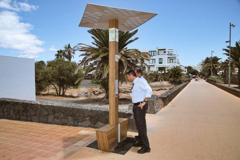 El alcalde de Teguise, Oswaldo Betancort, y el concejal de Turismo de Teguise, Antonio Callero, comprobaron el funcionamiento del nuevo tótem vertical con paneles solares ubicado en la avenida Arenas Blancas, en la playa de Las Cucharas, que permite la recarga de dispositivos móviles.