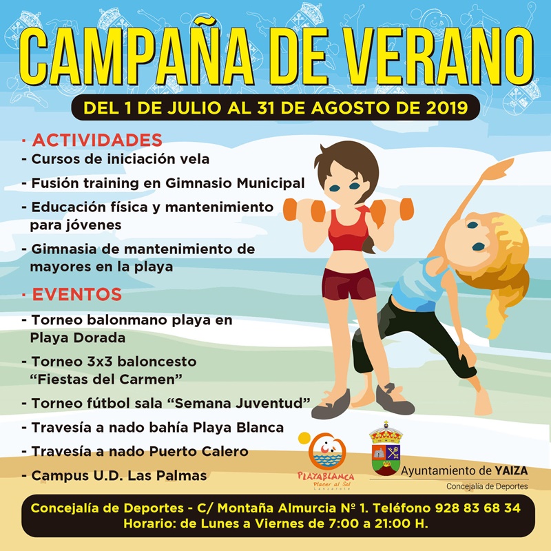 El Ayuntamiento de Yaiza ha abierto su Campaña Deportiva de Verano ofreciendo diversidad de propuestas para que chicos y grandes disfruten practicando deporte e invirtiendo el tiempo de ocio en actividades saludables. Toda la información sobre actividades, disciplinas y pruebas deportivas de la Campaña puede consultarse en el banner de portada de la web municipal www.yaiza.es, donde aparece detallado (fechas, lugares y horarios) el programa del 1 de julio al 31 de agosto organizado por la Concejalía de Deportes de Yaiza.