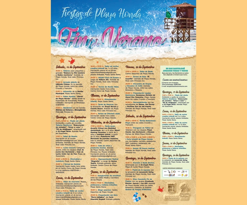 Diversos talleres y actividades deportivas, encuentros para mayores y jóvenes, gastronomía, música, el tradicional festival de cometas, presentaciones culturales, actividades en familia y una divertida agenda pensada para los chinij@s conforman el programa de estas Fiestas de Fin de Verano de Playa Honda, que puede ser consultado íntegramente en la página web del Ayuntamiento de San Bartolomé https://www.sanbartolome.es/ así como en las redes sociales municipales.