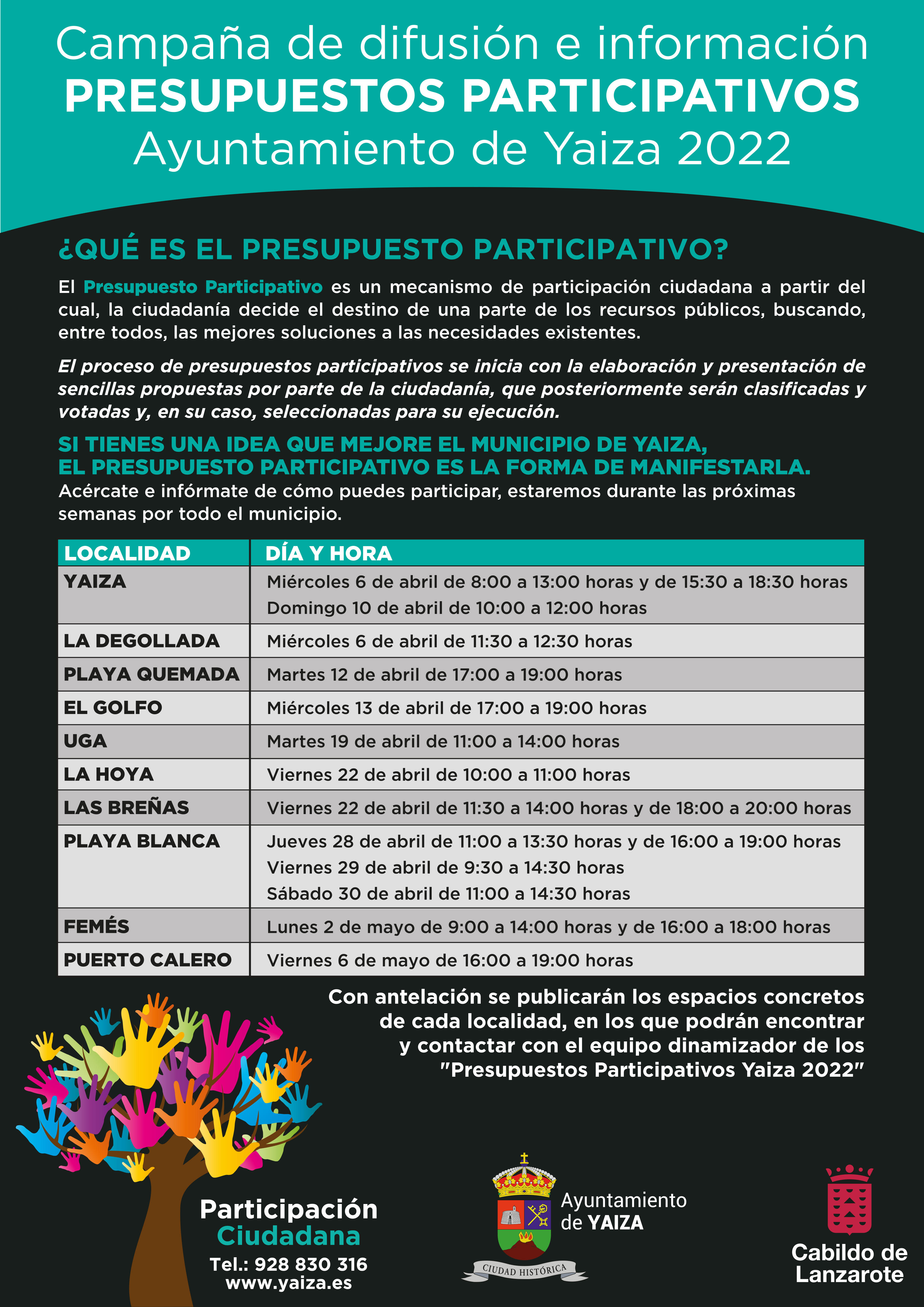 El Ayuntamiento de Yaiza impulsa una campaña de difusión y asesoramiento para acercar las ventajas de los Presupuestos Participativos a la ciudadanía, fomentando su implicación en la toma de decisiones de la vida pública a través del diseño de propuestas orientadas a la mejora de servicios e infraestructuras del municipio. Esta semana la experiencia se traslada a Playa Quemada y El Golfo, aunque ya el pasado 6 de abril los encuentros comenzaron en Yaiza y La Degollada con vecinos, vecinas y asociaciones por parte del equipo dinamizador, que recorre los distintos núcleos sureños como paso previo a la apertura del plazo de presentación de los proyectos.