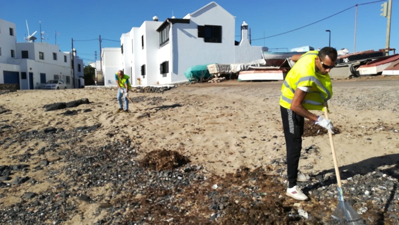 La concejal Ángela Hernández destacó que desde el Ayuntamiento de Arrecife se ha destinado a personal del convenio para las tareas de limpieza de esta playa, limítrofe con el litoral de Teguise.