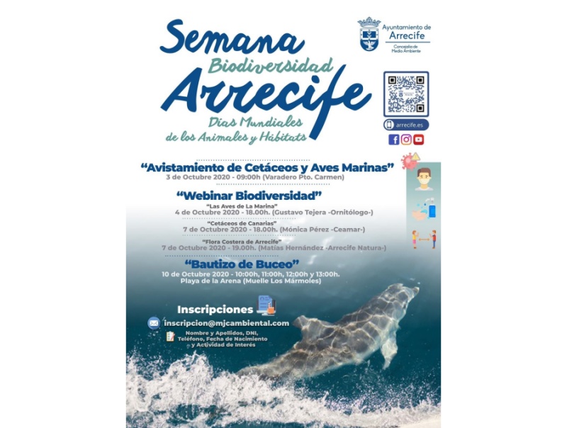 Estas actividades, que arrancaron en septiembre con los Días Mundiales Marino y Sin Coches, respectivamente, son impulsadas por la Concejalía de Medio Ambiente del Ayuntamiento de Arrecife, bajo la coordinación de la concejal popular Ángela Hernández Cabrera. Ahora, para este próximo fin de semana, coincidiendo con los días mundiales de los animales y hábitat, el Consistorio de Arrecife organiza una salida en barco por el litoral de la isla para avistar cetáceos marinos y aves marinas, y un bautizo de buceo ( que se realizará en la Playa de la Arena, junto al Castillo de San José), así como varios webinar sobre biodiversidad enfocada con los ecosistemas que rodean a Arrecife, o al conjunto de la isla de Lanzarote.