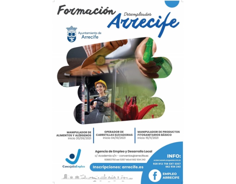 Las fechas previstas para su realización son los meses septiembre, octubre y noviembre: Manipulador de Alimentos y Alérgenos, del 20 al 27 de septiembre, en horario de 9 a 14 horas; operador de Carretillas Elevadoras, el 4 y 5 de octubre, de 16 a 21 horas; y Manipulador de Productos Fitosanitario básico del 15 al 19 de noviembre, de 9 a 13 horas. La solicitud de inscripción podrá descargarse de la página web del Ayuntamiento de Arrecife, retirarse en la Agencia de Empleo y Desarrollo Local, sita en la calle Academia s/n, o solicitarse a través del email