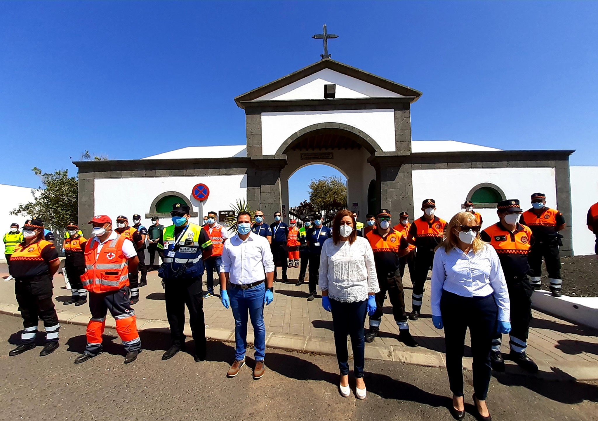 Los exteriores del cementerio de San Román, en la capital de Lanzarote, acogieron en la mañana de este domingo un acto con una representación de todos los colectivos que intervienen en la lucha con el coronavirus y han guardado un minuto de silencio en recuerdo a la memoria de todas las personas que en Lanzarote, Canarias, España y en el mundo han fallecido con el Covid-19. El Ayuntamiento de Arrecife, impulsor de esta iniciativa, ha depositado varias coronas en recuerdo de estas personas fallecidas.