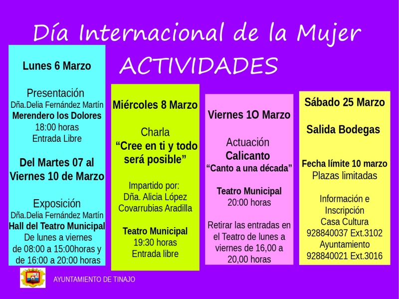 La Concejalía de Igualdad del Ayuntamiento de Tinajo llevará a cabo un itinerario de actividades, a lo largo del mes de marzo, para conmemorar el Día Internacional de la Mujer. El primer evento tendrá lugar el 6 de marzo con la presentación de la exposición de Delia Fernández y el último el 25 con la visita a las bodegas.