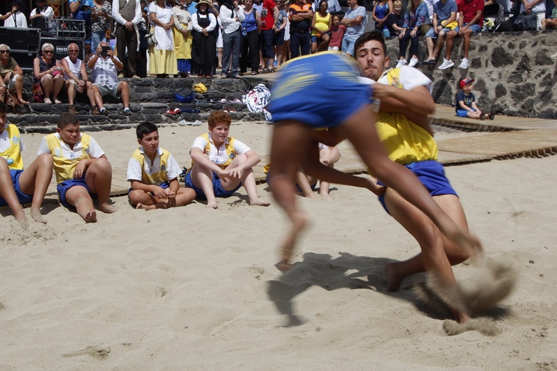 Tal y como indician desde el Ayuntamiento, Yaiza también dio protagonismo a la lucha canaria, muy bien representada por niños y jóvenes de la Escuela de Playa Blanca que ofrecieron una exhibición del deporte vernáculo en la playa pequeña del pueblo, allí en ese terrero natural de condiciones excepcionales donde entrena la cantera de luchadores del municipio que dirige el mandador – formador Tomás Quesada.