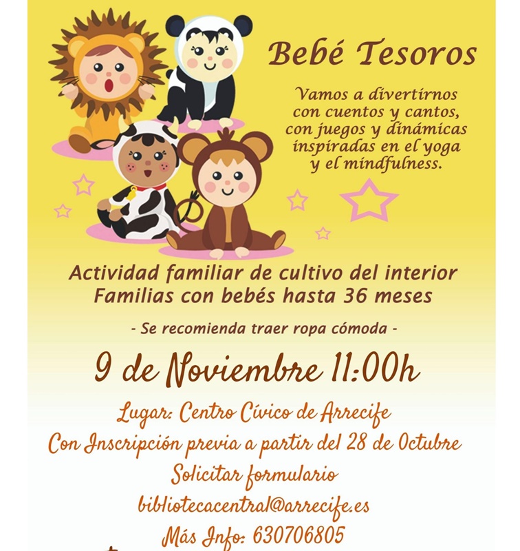 El próximo 28 de octubre se abrirán las inscripciones para las actividades de "Bebé y Peque Tesoros". Estos talleres, dirigidos a un público infantil, tienen como objetivo fortalecer los vínculos afectivos de los menores hacia los progenitores así como potenciar la sociabilización de estos pequeños mediante juegos y cuentos. Las sesiones se llevarán a cabo en el Centro Cívico de Arrecife con una capacidad de doce participantes por sesión sin contar con los adultos que acompañen a los pequeños.