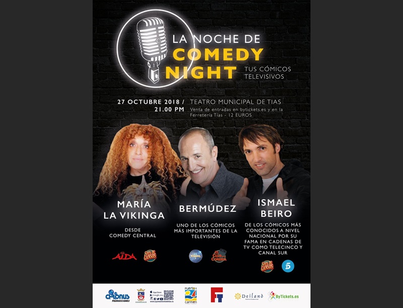 La Concejalía de Cultura del Ayuntamiento de Tías, bajo la dirección de Amado Jesús Vizcaíno, ha programado en el Teatro Municipal de Tías, en la noche de este sábado, día 27 de octubre, a las 21 horas, la actuación humorística ' La Noche de Comedy Night', donde las carcajadas llenarán la noche del centro de Tías.