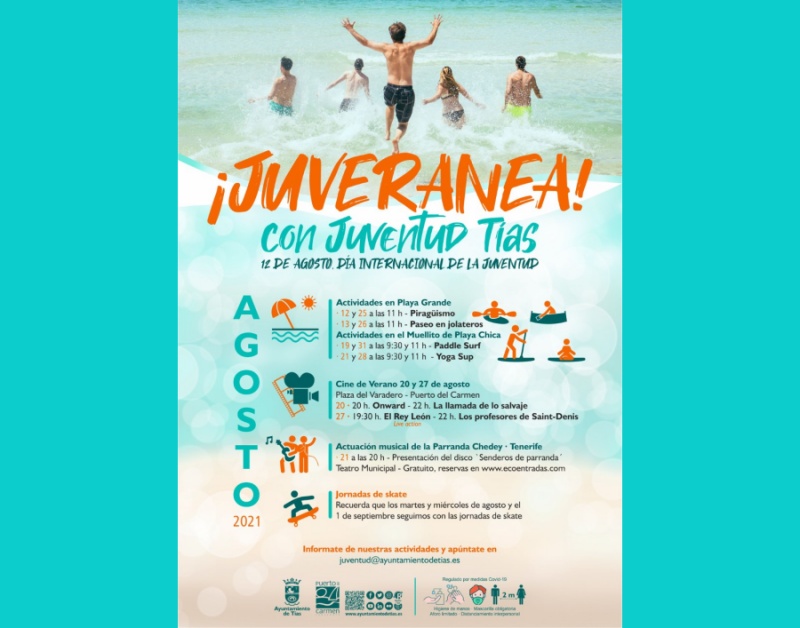 El Ayuntamiento de Tías ha preparado una programación completa para celebrar el Día Internacional de la Juventud el próximo 12 de agosto. A partir de esa fecha comenzarán las actividades de piragüismo, paseo en jolateros, paddle surf, yoga sup, cine de verano, skate y la actuación de la parranda Chedey, de Tenerife.