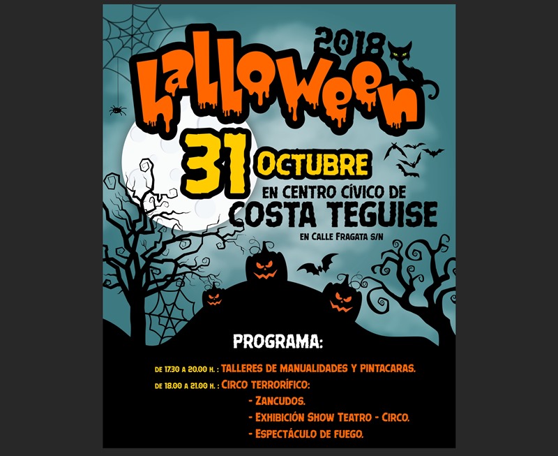 La noche de Halloween se celebrará de forma especial en la tarde noche de este miércoles en Costa Teguise. El Centro Cívico acogerá un programa para toda la familia, que arrancará a las 17.30 horas con talleres de manualidades y pintacaras, y continuará hasta las 21.00 horas con el Circo terrorífico, que contará con la actuación de zancudos, una exhibición de teatro-circo y un espectáculo de fuego.