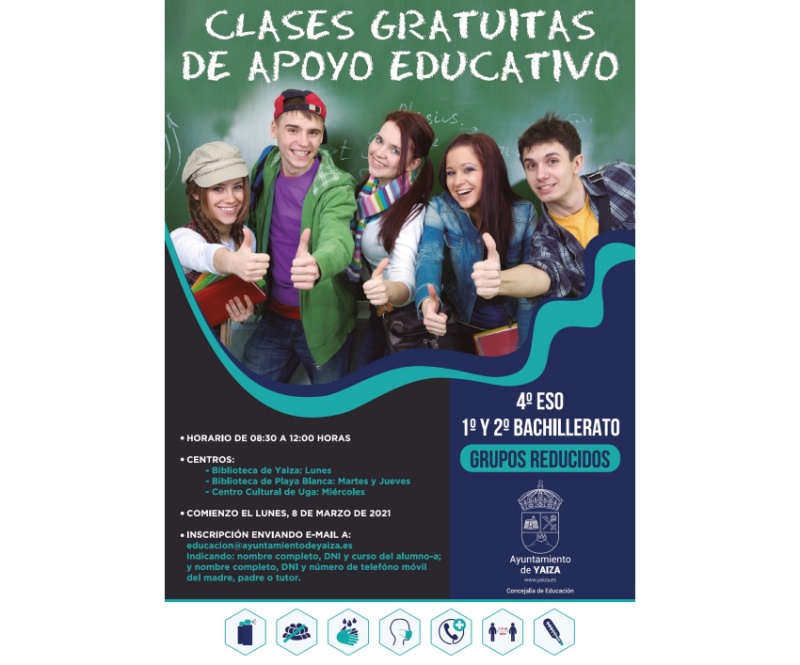 El Ayuntamiento de Yaiza ofrece clases gratuitas de apoyo educativo para estudiantes de 4º de la Eso y 1º y 2º de Bachillerato, a partir del próximo 8 de marzo, en horario de 8:30 a 12:00 horas, así: días lunes en la Biblioteca de Yaiza; martes y jueves en la Biblioteca de Playa Blanca; y miércoles en el Centro Cultural de Uga. Las clases se programan en horario de mañana porque la jornada lectiva en el IES Yaiza para 4º de la Eso y Bachillerato se desarrolla por la tarde.