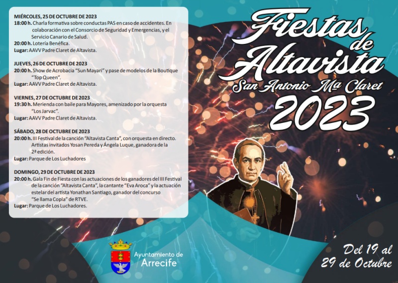 A partir del sábado 27 las Fiestas de San Antonio María Claret de Altavista se trasladan al Parque de Los Luchadores, donde a las 20 horas tendrá lugar el 'III Festival de la canción Altavista Canta', con orquesta en directo y Yosan Pereda y Ángela Luque, ganadora de la segunda edición, como artistas invitados.