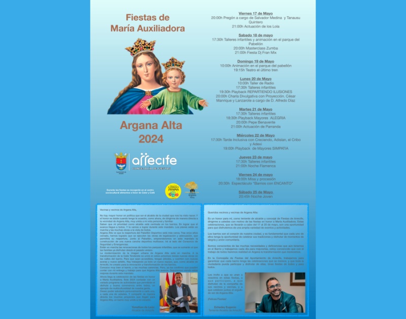 Las Fiestas de Argana Alta en honor a María Auxiliadora, organizadas por la Concejalía de Fiestas del Ayuntamiento de Arrecife, dirigida por el teniente de alcalde, Echedey Eugenio, en colaboración con la asociación "La vida es Zuaina" y el colectivo vecinal "Argana Viva", arrancan hoy viernes 17 de mayo a las 20:00 horas con la lectura del pregón a cargo de Salvador Medina y Tanausú Quintero, y se extenderán hasta el sábado 25 de mayo.