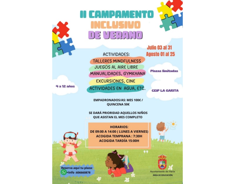 El Ayuntamiento de Haría pone en marcha la segunda edición del Campamento Inclusivo de Verano. Este tendrá lugar del 3 al 31 de julio y del 1 al 25 de agosto y está destinado a niños y niñas de 4 a 12 años.