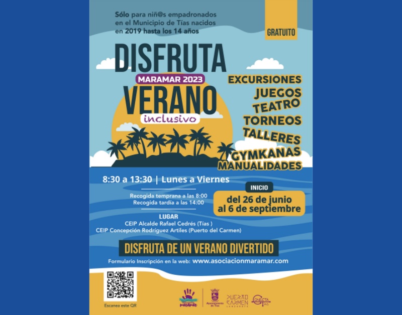 "Disfruta de un verano divertido e inclusivo" es uno de los lemas de este proyecto, organizado por la asociación Maramar a través de la estrategia comunitaria del Ayuntamiento, Conecta Tías. Se ofrecerán excursiones, juegos, teatro, torneos, yincanas y manualidades y la inscripción se debe llevar a cabo a través de la página web www.asociacionmaramar.com a partir de las 16 horas de hoy.
