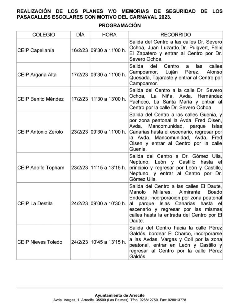 El Ayuntamiento de Arrecife ha publicado el recorrido que realizarán este año los distintos pasacalles escolares con motivo del carnaval 2023.