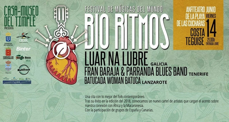 Tras su éxito en la edición del 2018, el Ayuntamiento de Teguise convoca un nuevo cartel de artistas que cargan el acento sobre la conexión de Canarias con África y la Macaronesia. El Festival de Músicas del Mundo, Bio Ritmos, contará con la participación de grupos de España y Canarias, que representan lo mejor del folk contemporáneo, como es el caso de Luar Na Lubre (Galicia), Fran Baraja & Parranda Blues Band (Tenerife) y Batucada Women Batuca (Lanzarote).