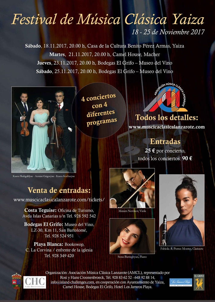Música Clásica Yaiza finaliza el sábado 25, a las 20:00 horas, en Bodegas El Grifo con obras de Tschaikowski, Schumann y Aram Khachaturian, interpretadas por el trío que homenajea con su nombre al compositor armenio y los demás músicos invitados a la edición 2017.