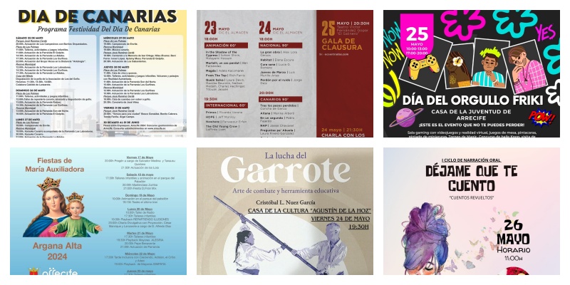 Entre las propuestas destacadas se encuentran las celebraciones del Día de Canarias, el Día del Orgullo Friki, las Fiestas de Argana Alta, el Festival Internacional de Cine en Lanzarote, un taller y presentación de un libro sobre la lucha del garrote canario, y la segunda sesión del primer ciclo de narración oral "Déjame que te cuento".