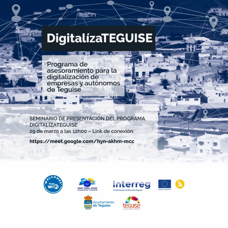 El Ayuntamiento de Teguise ofrece este miércoles el seminario virtual "DigitalízaTEGUISE", con el objetivo de presentar el programa de asesoramiento para la digitalización de empresas y autónomos de Teguise que lleva el mismo nombre, una iniciativa para ayudar al tejido empresarial del municipio a su digitalización, desarrollado gracias al proyecto WELCOME2.