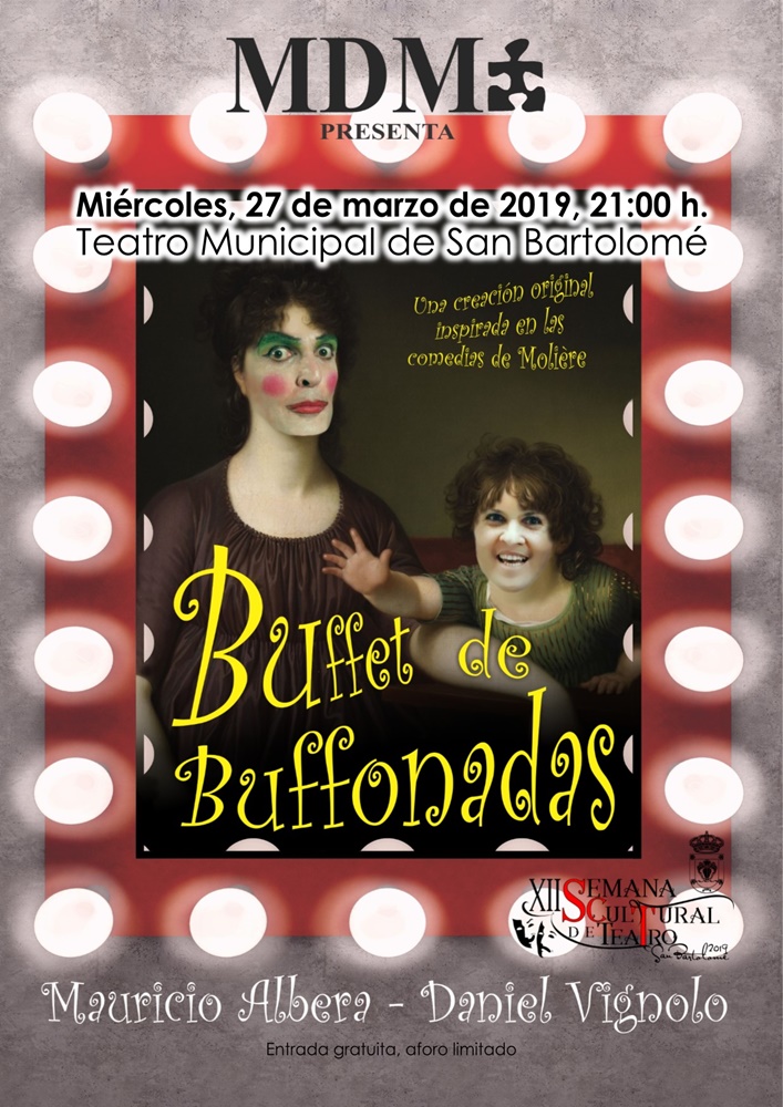 La XII Semana Cultural de Teatro de San Bartolomé, organizada por la concejalía de cultura del Ayuntamiento de San Bartolomé, da comienzo con la obra teatral “Buffet de Bufonadas” a cargo de MDM Producciones, hoy miércoles, día 27 de marzo, a las 21.00 horas. La entrada es gratuita, hasta completar aforo, apta para todos los públicos.