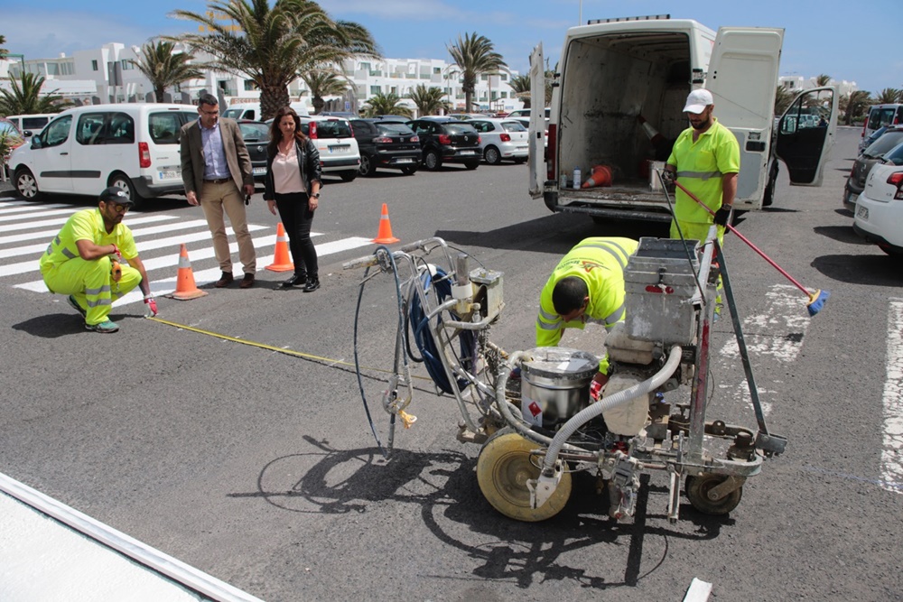 El alcalde de Teguise, Oswaldo Betancort, comprobó con la concejal del área, Flora Guerra, cómo se finalizaba el repintado de las marcas viales de la Avenida de El Jablillo con pintura termoplástica, un sistema de señalización de fácil instalación que proporcionará un mayor tiempo de reacción a los conductores.
