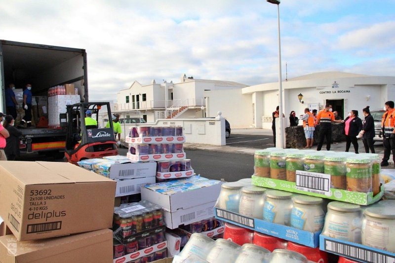 El engranaje liderado por el Ayuntamiento de Tías se pone en marcha desde primera hora y no para preparando el espacio, descargando, colocando y distribuyendo. Tras la llegada de los contenedores y los preparativos necesarios, los repartos a las familias se llevan a cabo tres veces en semana.