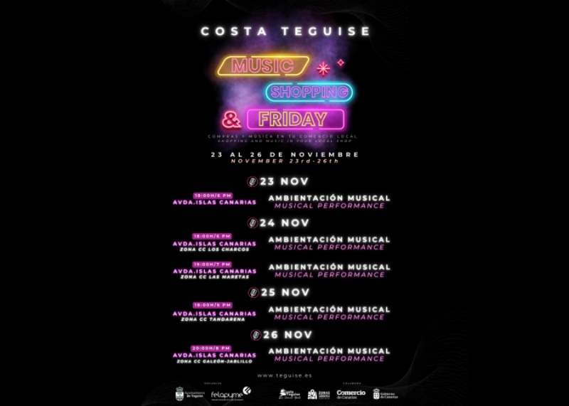 La campaña de Black Friday llega a Costa Teguise bajo el nombre “Music, Shopping & Friday”, con el objetivo de apoyar y potenciar el comercio y la restauración local de la zona.