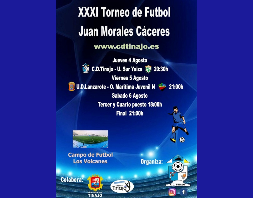 El CD Tinajo será el anfitrión y organizador del XXXI Torneo de Fútbol Juan Morales Cáceres, que arrancará este jueves 4 de agosto y se prolongará hasta este sábado, jornada en la que disputará la final. Los encuentros se disputarán en el Campo de Fútbol Los Volcanes y además del conjunto tinajero participarán el Unión Sur Yaiza , la UD Lanzarote y el Orientación Marítima Juvenil.