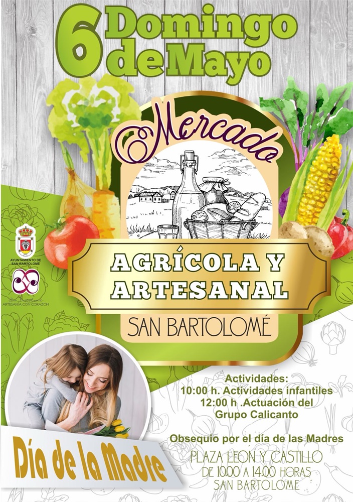 El Mercado Agrícola y Artesanal de San Bartolomé que se celebra el primer domingo de cada mes en la Plaza León y Castillo, de 10.00 a 14.00 horas, en la edición del mes de mayo tendrá como temática central el Día de la Madre, por lo que aquellas personas que acudan podrán además de hacer sus compras de productos de la tierra (quesos, miel, mojos, mermeladas, fruta, verdura y hortalizas, dulces y productos elaborados con batatas, pejines, tollos, aceites de oliva elaborado en Canarias, comida deshidratada), y artesanía (jabón natural, juguetes infantiles, elementos decorativos realizados con material reciclado, decoración en madera, bisutería, objetos decorativos y bisutería elaborada con la técnica de roseta y empleita) disfrutar de la velada con las actividades programadas, que darán comienzo desde 10.00 horas, con un taller para niños/as en el que confeccionarán un pin en forma de sombrera, que cada uno lo decorará a su gusto y podrá regalar a su madre.
