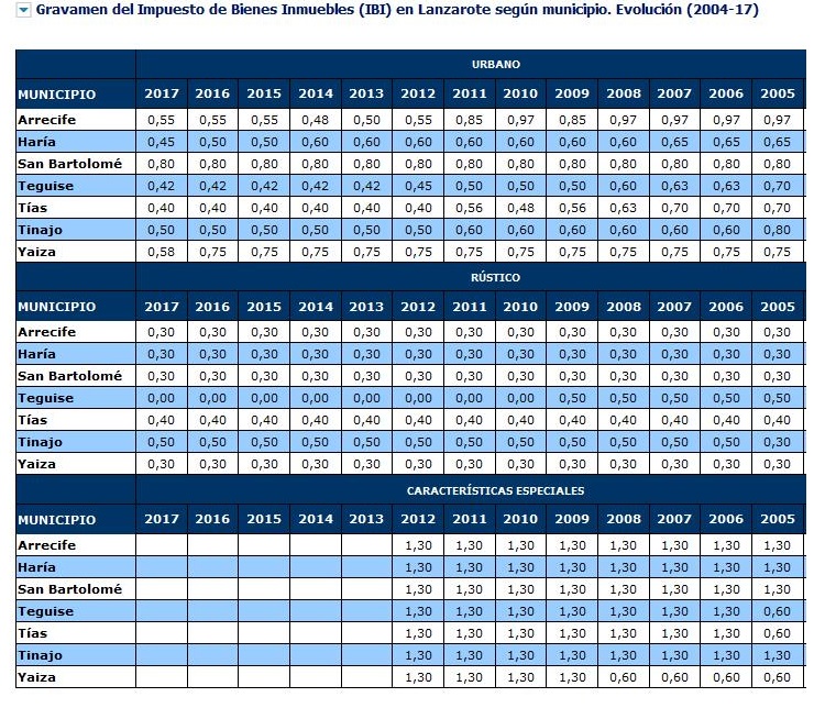 Los vecinos y empresas ubicadas en el municipio de Tías están pagando el gravamen del IBI más bajo de todos los siete municipios de Lanzarote. Desde el año 2012 el Ayuntamiento de Tías tiene el tipo impositivo más bajo en la isla de Lanzarote del Impuesto de Bienes Inmuebles (IBI) de naturaleza urbana, según refleja el estudio comparativo difundido en el día de ayer por el Centro de Datos de Lanzarote (Cabildo de Lanzarote) teniendo como base los criterios de la Dirección General del Catastro del Ministerio de Economía y Hacienda.