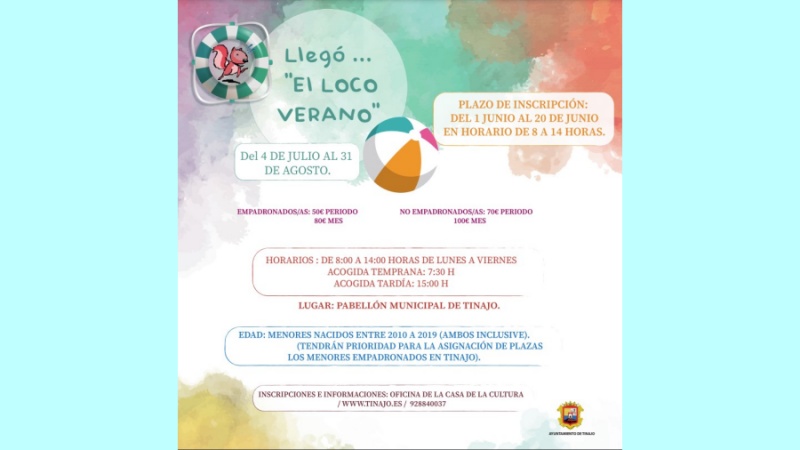 “El loco verano” es una iniciativa que se desarrollará en Tinajo del 4 de julio al 31 de agosto, de 08:00 a 14:00 horas, en el Pabellón Municipal de Tinajo para los menores nacidos entre 2010 y 2019.