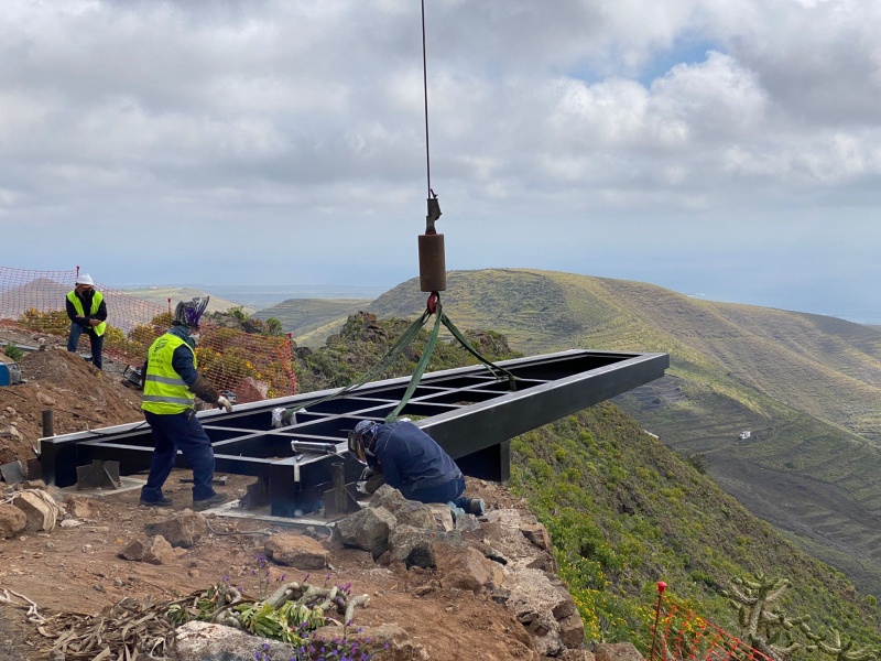 El Ayuntamiento de Haría sigue avanzando en la obra de rehabilitación del Mirador de Haría, con la instalación de las estructuras de las dos pasarelas de la infraestructura, logrando acercarse cada vez más al objetivo de recuperar estas instalaciones y de finalizar unas actuaciones necesarias para un monumento histórico para la población y visitantes del municipio norteño.