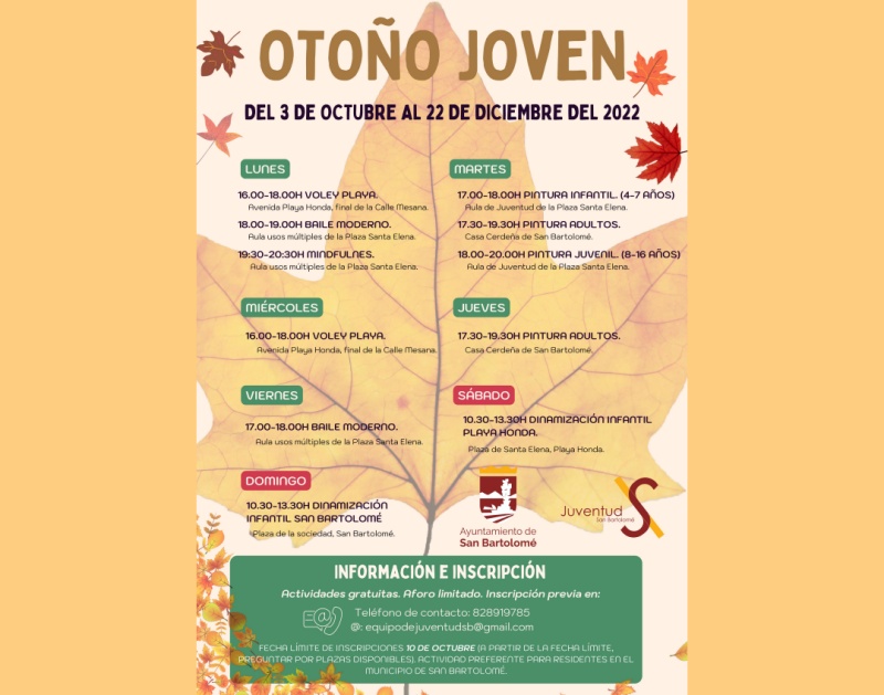 La campaña de actividades “Otoño Joven” que tendrá una duración de 3 meses, comenzará el próximo 3 de octubre, con actividades de Pintura, Baile deportivo, Voley Playa o curso de Mindfulness, además de contar con Dinamizaciones infantiles en las mañanas de sábados y domingos.