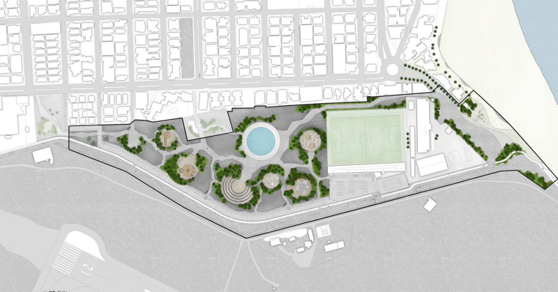 El anfiteatro está contemplado en el cráter más grande multiplicando el número de muros en arco que estructuran la lógica de todo el parque y sirviendo aquí además como bancada para los espectadores que vengan a disfrutar del teatro local o cualquier otro tipo de actividad cultural. Habrá un lago artificial, un bar con mirador, un skate park y un parque canino.