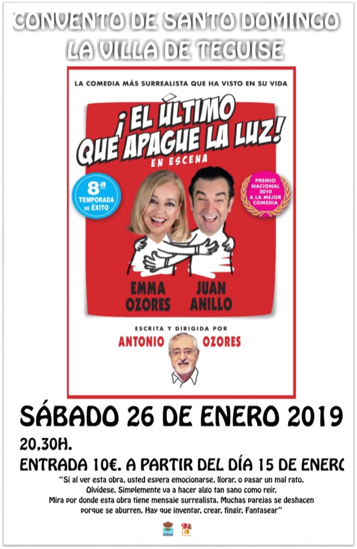 La obra teatral titulada El último que apague la luz, de Antonio Ozores e interpretada por Emma Ozores y Juan Anillo, es la atractiva propuesta de 90 minutos que propone Teguise para el próximo sábado, 26 de enero, a las 20.30 horas, en el Convento Santo Domingo de la Villa de Teguise.