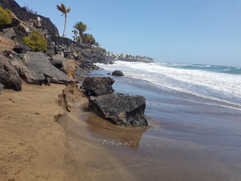 El intenso oleaje ha permitido al mar adentrarse en los recientes baños rehabilitados por el Ayuntamiento de Tías en esta playa muy frecuentada por los miles de turistas que se alojan en Puerto del Carmen. La fuerza del mar, además de llevarse enormes cantidades de árido, ha dañado- con la pérdida de la arena, la base de un tramo del paseo marítimo donde el Ayuntamiento de Tías tiene programada varias actuaciones ( ya adjudicadas tras su licitación) para mejorar la escollera de la Avenida de las Playas.