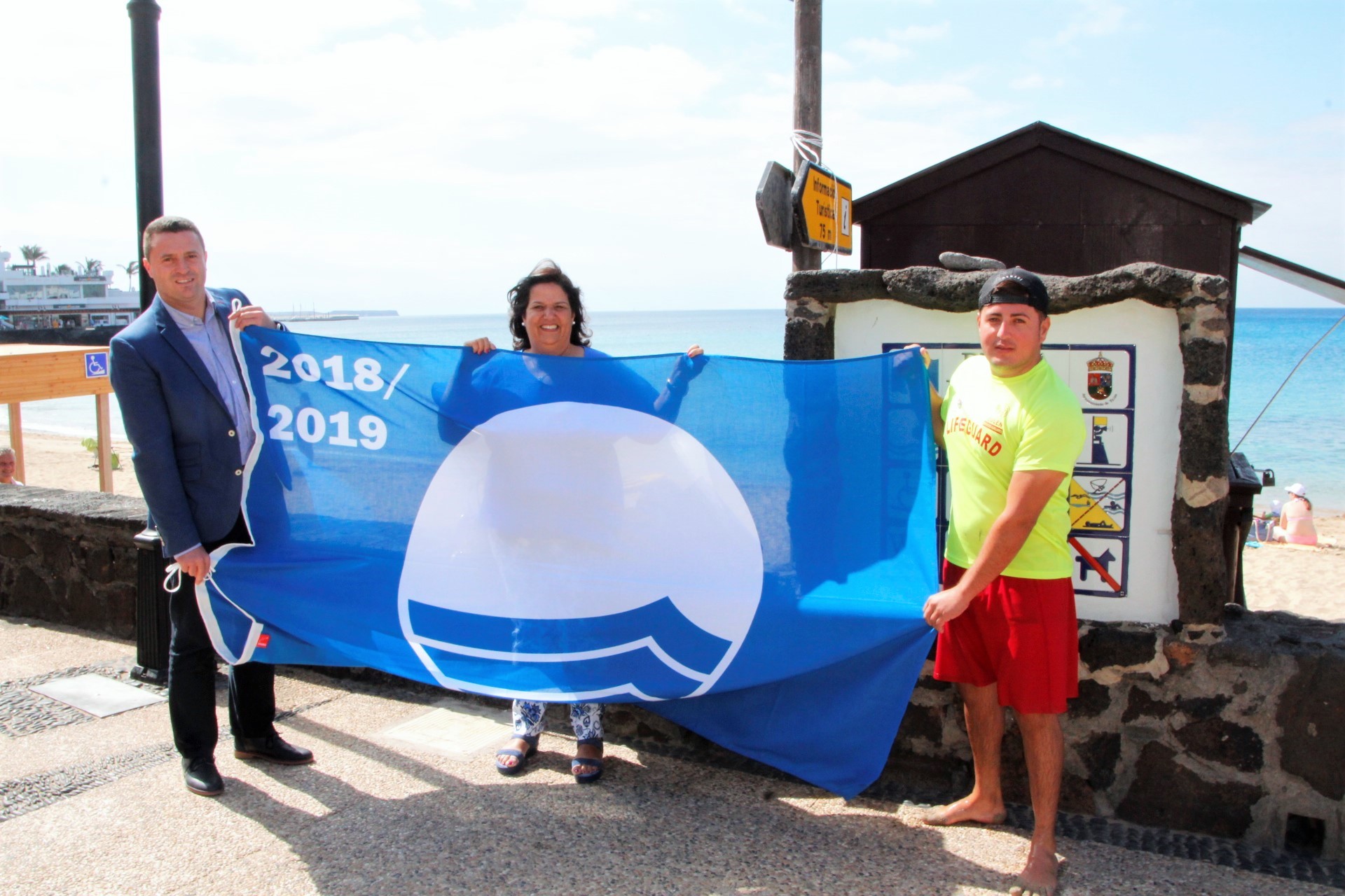 El alcalde de Yaiza, Óscar Noda, y la concejala de Turismo, Olga Caraballo, izaron este jueves en la playa pequeña de Playa Blanca la bandera azul 2018 – 2019 que la distingue como una playa segura, de agua limpia y dotada de servicios complementarios.