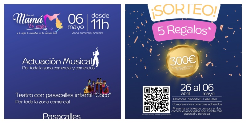 Este Día de la Madre comprar en Arrecife tiene premio. Todas aquellas personas que compren en los comercios asociados entre el 26 de abril y el 6 de mayo, podrán entrar en el sorteo de 5 regalos valorados en 300€ si suben su ticket de compra en www.arrecifevirtual.com o a través del QR disponible en los comercios adheridos, en las redes sociales de la zona comercial y en el photocall que estará instalado el sábado 6 en la Calle Real