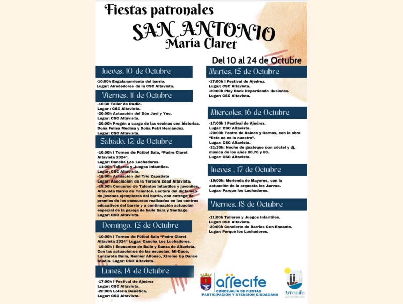 El programa de actos, elaborado por la Asociación de Vecinos Padre Claret y la Comisión de Fiestas con el patrocinio de las Concejalías de Fiestas y Participación Ciudadana del Ayuntamiento de Arrecife, dirigidas respectivamente por el teniente de alcalde Echedey Eugenio y la edil Cathaysa Suárez, proseguirá a las 10 horas del sábado 12 con la celebración del torneo de fútbol sala en la cancha de Los Luchadores y los talleres y juegos infantiles en el Centro Sociocultural a partir de las 11 horas.